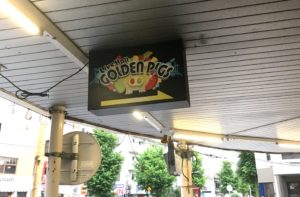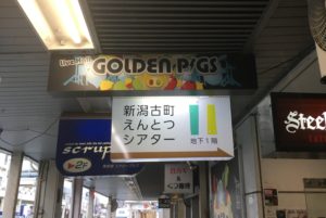 古町停留所で降りたところに郵便局と第四銀行がある交差点があるけど、両方を背にしてまっすぐ進みます。ミスドやセブンイレブンを通り過ぎて信号2つ目のところに、GOLDEN PIGSへの案内看板がありました。