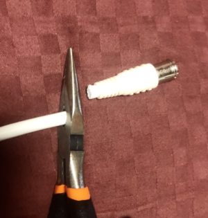 4mm分の編線を外側に折り返します。そしたら「かしめ用リング」をケーブルに通し、続いて折り返した編線とアルミ膜の間にプラグを差し込みます。「回しながら押し込んでください」とありますが、要は「ねじ込みながら押し込む」という意味です。最初正直に回しながら入れたら全然入らなくて何これどういうこと??となってしまいました^^;ぐりぐりねじ込んでいきます。無理やりねじ込んでいくので外側のケーブルがボコッと膨らみますが、それで合ってます。↑こんな感じに。
