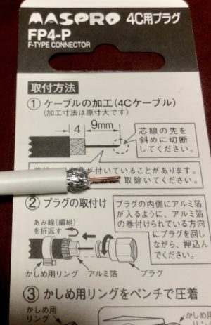 BSアンテナが引っこ抜けたり、ずれたりして、肝心な時にWOWOWが映らなくなることに気づいたので、最初はネジで締めるタイプのを買い換えようと思ったんだけど、○’s行ったら見事なまでにネジ式がない!! 見たら口金?プラグ?っていうのかな?(ド素人全開)それが別売りされてて、加工前の15mとか30mとかながーいアンテナ線ばっかり!えー、ネジのやつがいいのになあ。。。と思い、「うちに無事なアンテナケーブルあるんですけど、ちょん切ってプラグ付け替えてもいいものなんすか?」って聞いたら、店員さんがいいよーっていうんで、口金買ってきましたよ。あ、プラグか。口金って家族に言ったら「ケーキのホイップクリームのやつしか思い浮かばない」って言われて、確かに。プラグですプラグ。