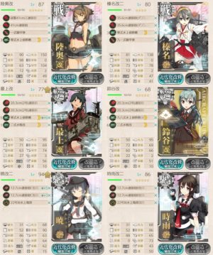 駆逐艦3隻(主にバルジ積み)の、「「三一駆」、鉄底海域に突入せよ!」任務でやった編成ですが、何気に今後も使うかも?と思ってメモ。支援艦隊なしで余裕で行けた!