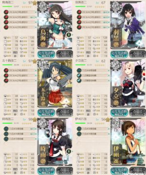 どうしても対潜が足りなくて、3スロ潜水艦がいないせいかああ!とやめそうになりましたが、対潜値高い軽巡といったら、我らが五十鈴姉さんがいるじゃないか!と組んだ編成です。あと潜水艦は2スロだけど、対潜の役に立たない代わりに、多少なりとも火力のたしになればと、火力が一番高い潜水艦の401改を入れています。