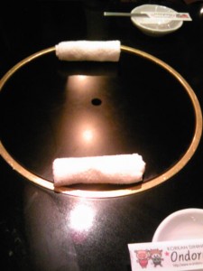 で、新大久保駅で降りてちょっと歩くと、もうすぐに「おんどる」の看板がある。おおわかりやすい。確か二号店っていうのも近くにあるんだ。とりあえず本店のほうに向かってちょっと裏路地に入ると、韓国人スタッフの方が出てきて、「本店いっぱいなので二号店お願いシマース」と言われたので、案内に従って二号店に向かった。スタッフさん同士で無線でやり取りしてて非常にスムーズです。待たされた記憶がありません。