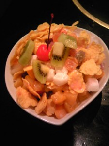 コーンフレークみたいなのに丸い餅のような(白玉より歯ごたえがある)ものと、フルーツがわんさか盛り付けられていて、練乳いちごのようなソースがたっぷりかかっています。
