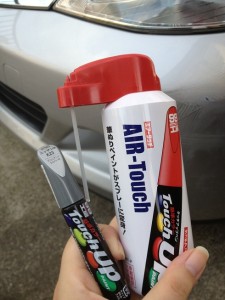 タッチアップペンていう、本来は筆式で塗り塗りする塗料なのだけど、この「エアタッチ」っていう空気が入ったスプレー缶にがちゃってセットすると、液体がスプレーになってしまうというすぐれもの。広い範囲を塗装するときは必需品です。