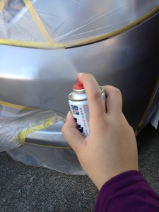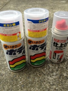 […] ある日車をむしゃくしゃしてこすってしまいました。前みたいにベコってぶつけたわけじゃないんだけど、わざわざ塗装を頼むと非常にお金がかかる。。。というわけで、自分で塗ってみることにした!←とりあえずぐぐってからホームセンターで道具を買い揃えてみた。何が何やらさっぱりわからん。とりあえず、傷埋めをしてサンドペーパーで磨き、エアータッチに塗料をセットしてスプレー式で塗装するという手順らしい。それを頭に入れて、塗装開始!<注意>作業は雨も風もない状態でやりましょう。因みに「光硬化パテ」を使う場合は、太陽光で即行硬化しちゃうんで、若干曇りの時に、できればカーポートの下などでやること。うええ、、意外と派手にやっちまってたらしい。。。orzサンドペーパーがキューブ状になったものが売っています。数字が小さいほう(粗いほう)から順番にごしごしやすります。最初はびくびくですが、後で塗装すると割り切って思い切りごしごしします。ささくれ(トゲトゲ)がなくなったら次の番号のサンドペーパー、次の番号、、というふうに段々表面を滑らかにしていきます。ここでちゃんと滑らかにしておかないと後で悲しいことになるのだ。。。わーお!!(T_T)やすってみたら実はもっとめっちゃ傷だらけなことが判明。。。。。。。。。orzとりあえずやすりにやすりまくり、つるつるになりました。。。。。あ、この作業をしていて初めて、この部分が「バンパー」ということを知った(バカ)てれれれん♪光硬化パテー!太陽光で固まっちゃうあれです。とりあえずこれを思いっきり塗り、厚みが出るくらいまで盛り付けてヘラでならします。この段階ではぼっこぼこの山盛りになりますがそれでいいんです。それを1時間くらい放置し(夏じゃなければもうちょと置いたほうがいいかも)完全にカチカチになったら粗めのサンドペーパーでごしごしやすってぼこぼこを平らにします。手で触ってつるつるになるくらいまでがんばる。ぎゃーす!!どんどん車がぶっ壊れていきます。でもこれで間違ってないんです。。。⇒それではいよいよ塗装へ!! […]