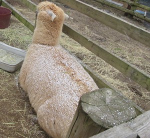 アルパカさんにも雪が積もってブッシュドノエルみたいになってます。